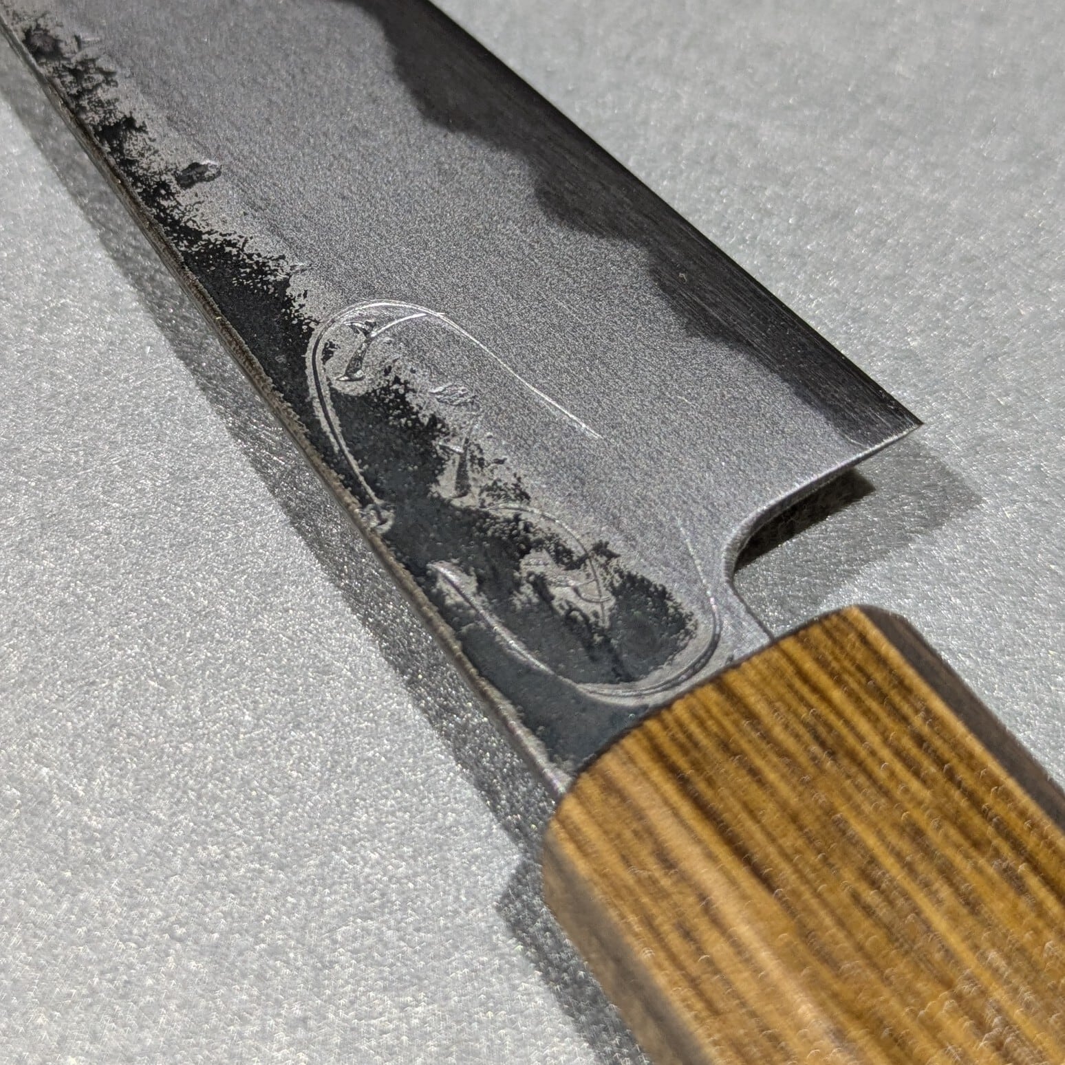 ※「黒打」(Kurouchi) refers to a technique where the black oxide film formed during forging or quenching is deliberately left intact, with only the cutting edge polished to completion.