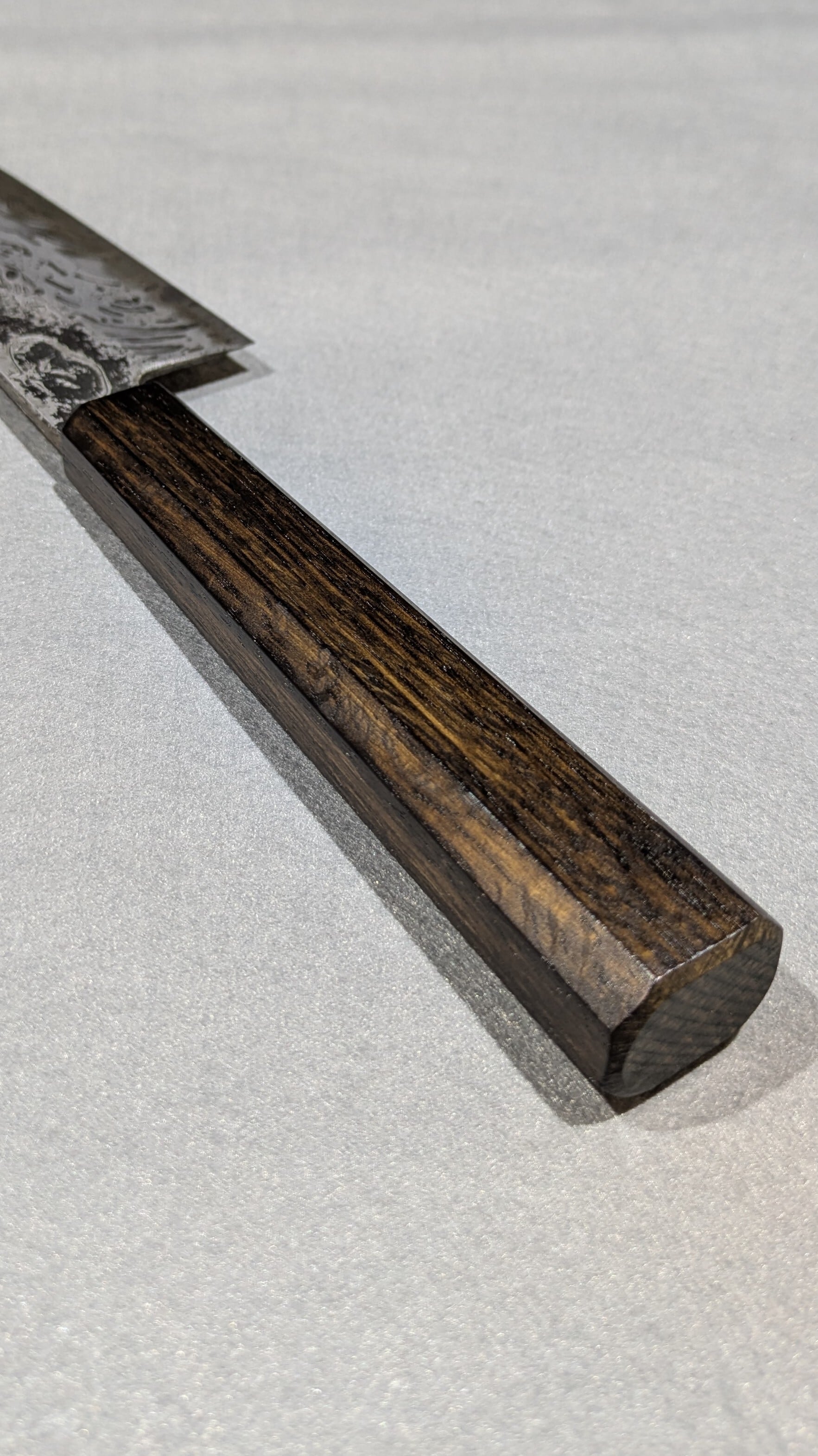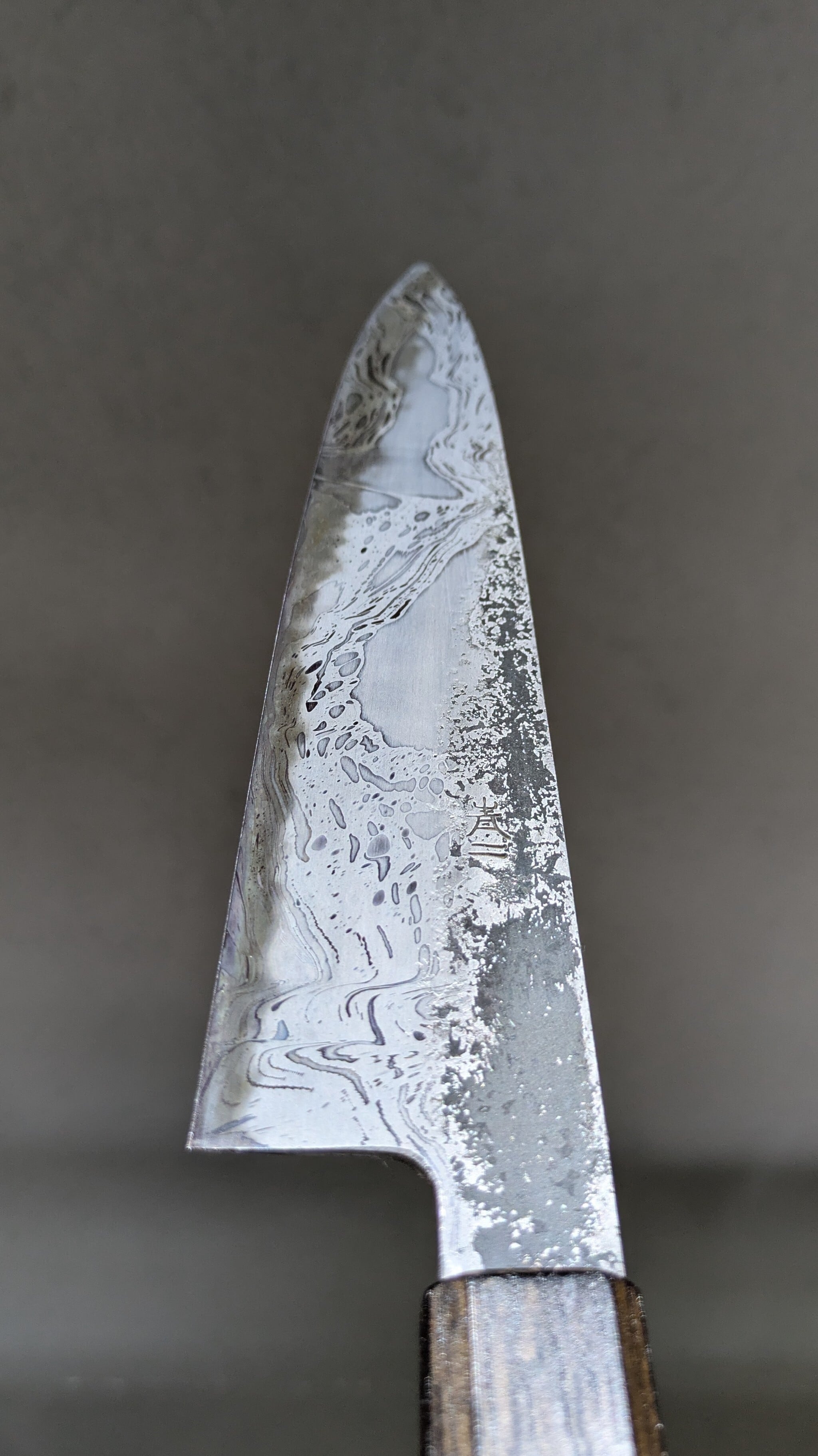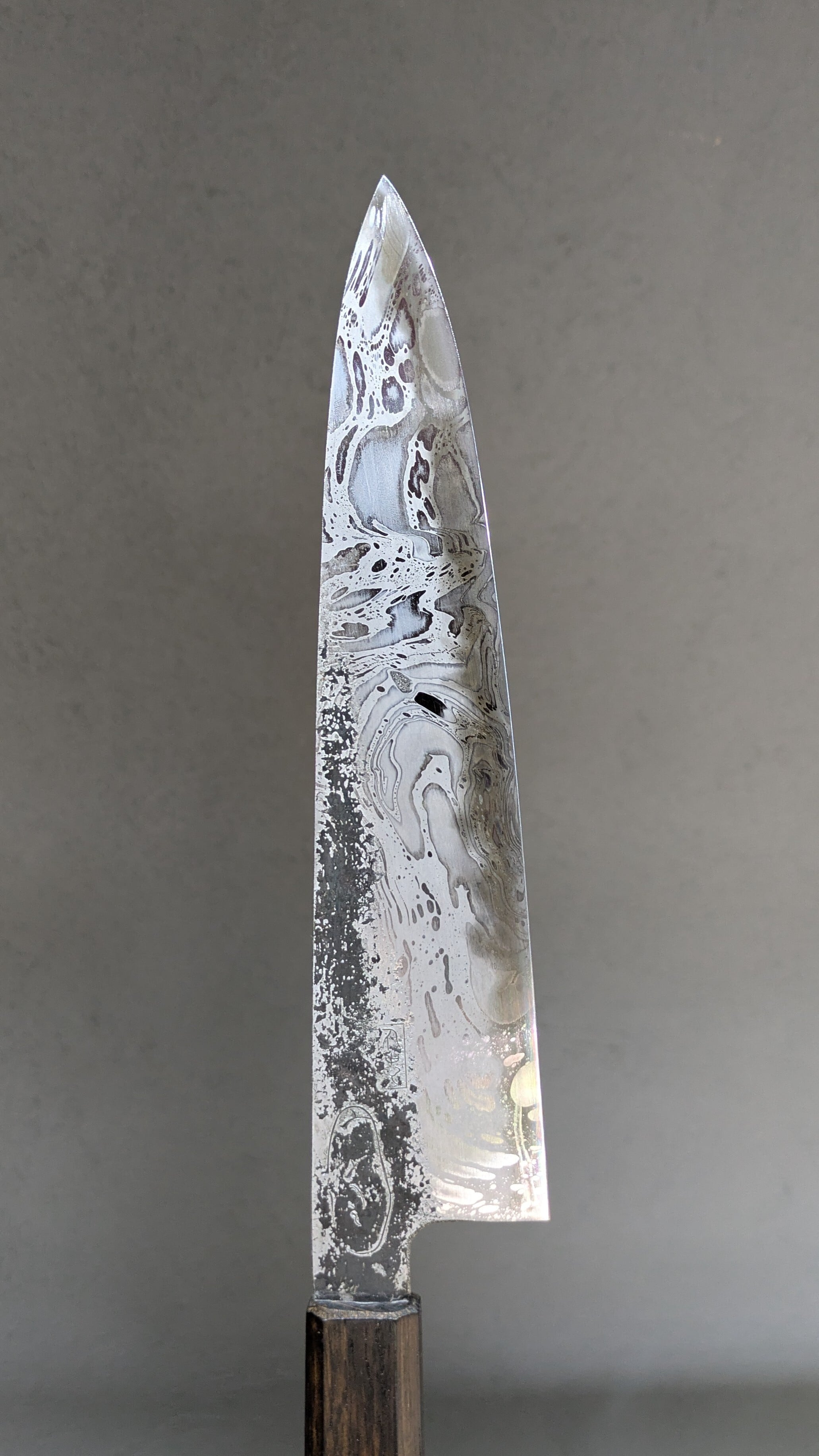 This is our shop's original kitchen knife. The blade surface has been etched to create a pattern.