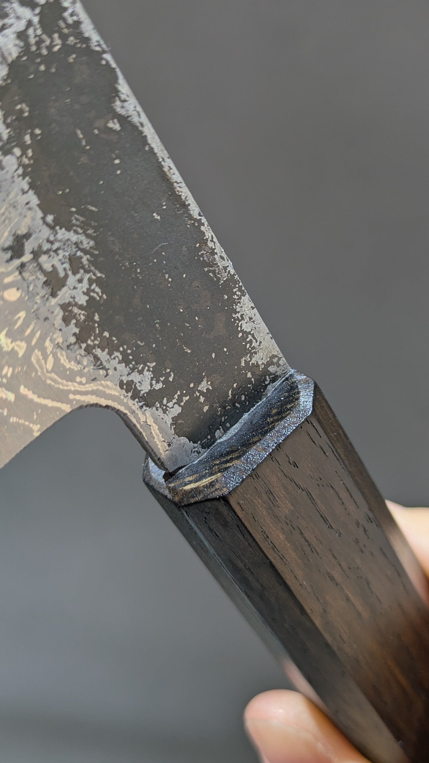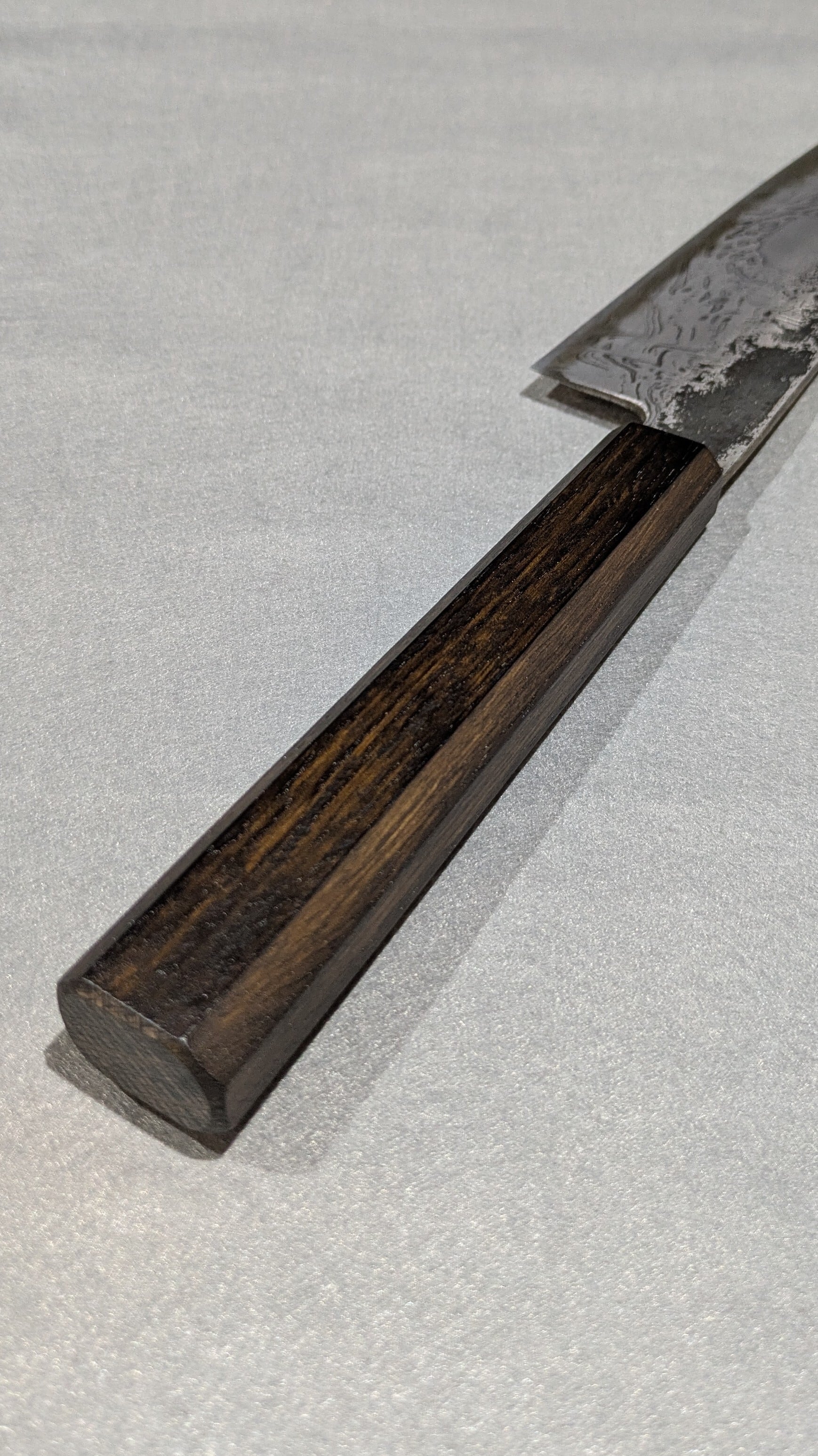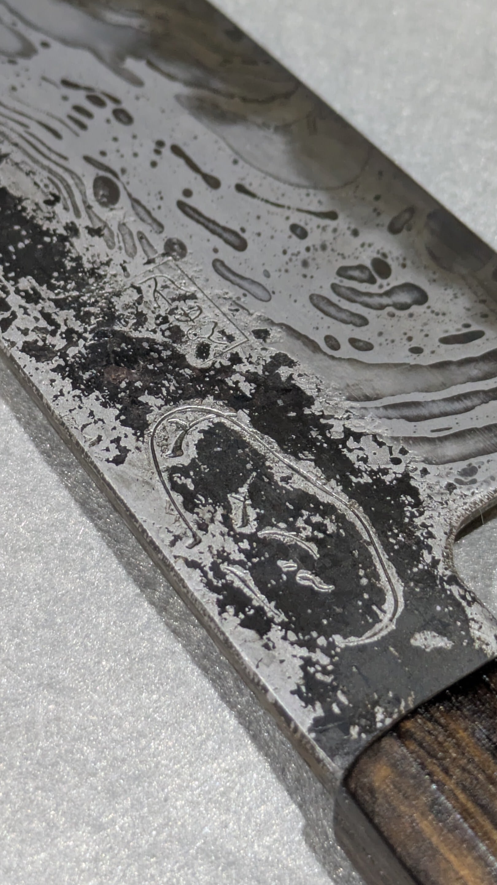 This is our shop's original kitchen knife. The blade surface has been etched to create a pattern.