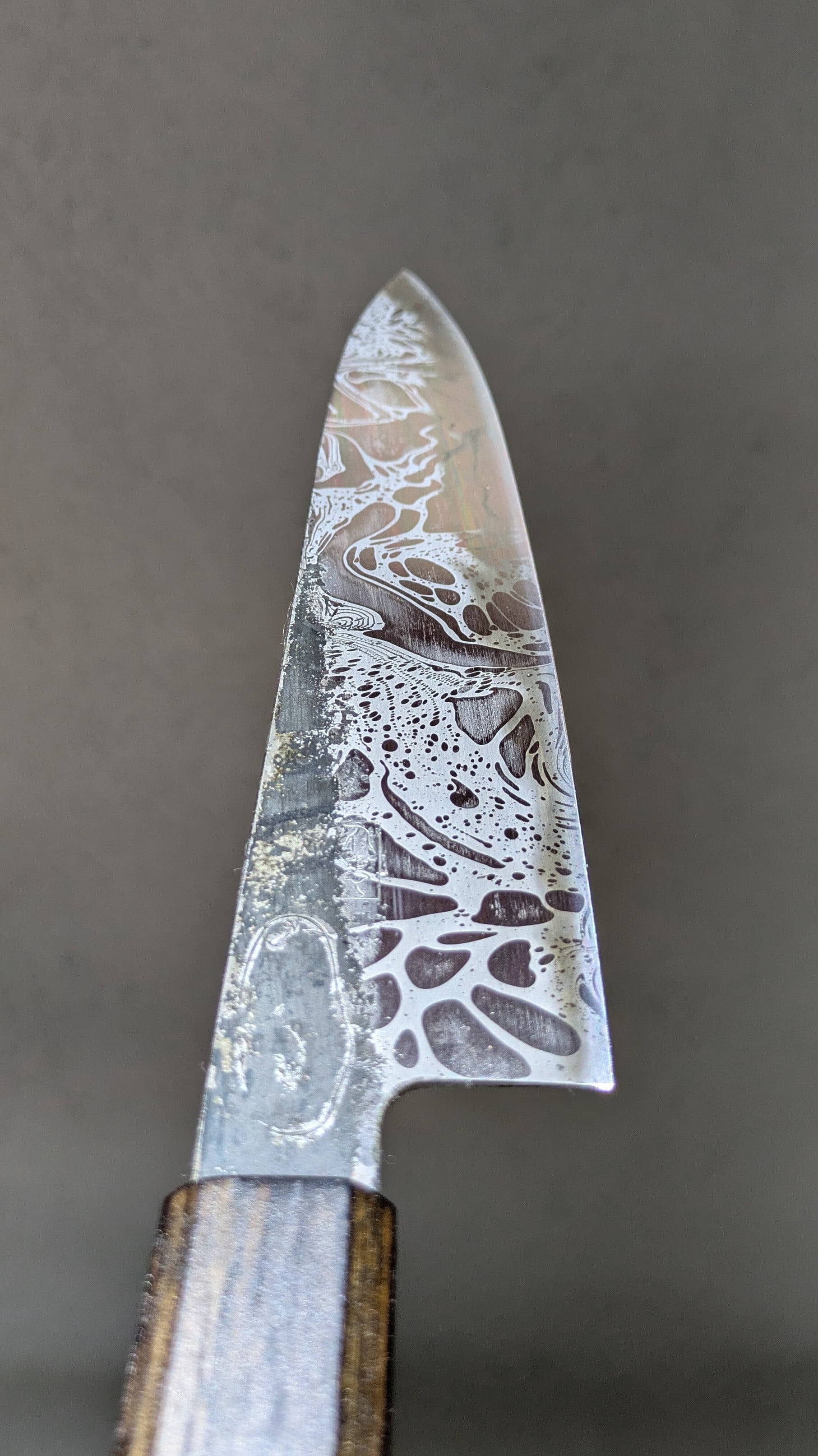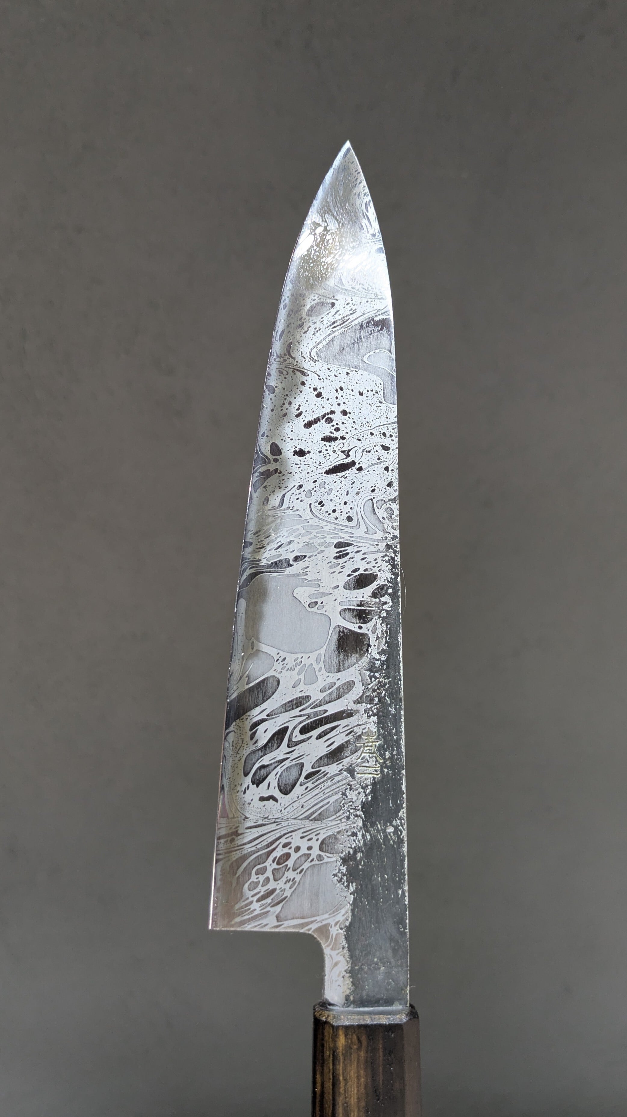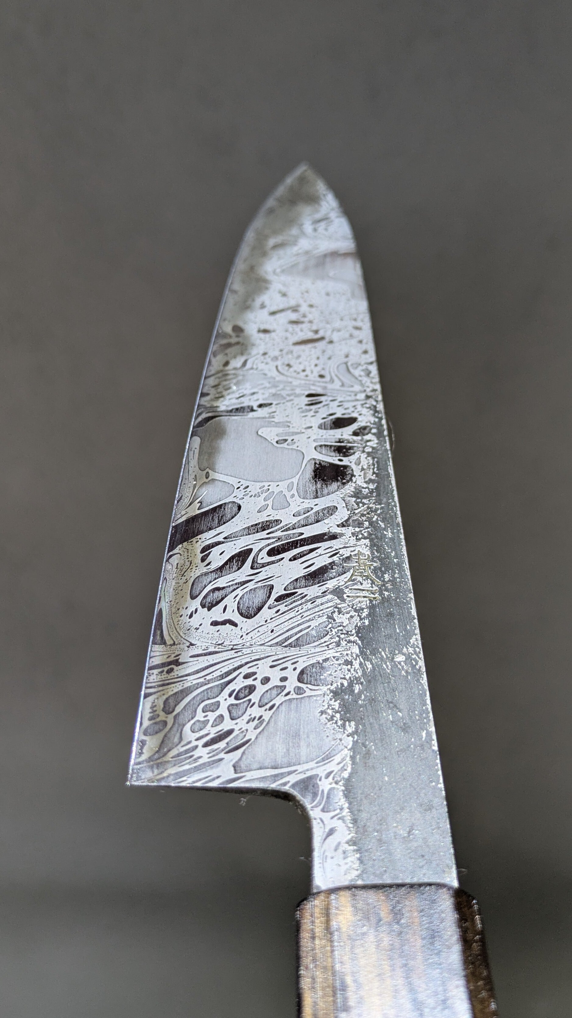 This is our shop's original kitchen knife. The blade surface has been etched to create a pattern.