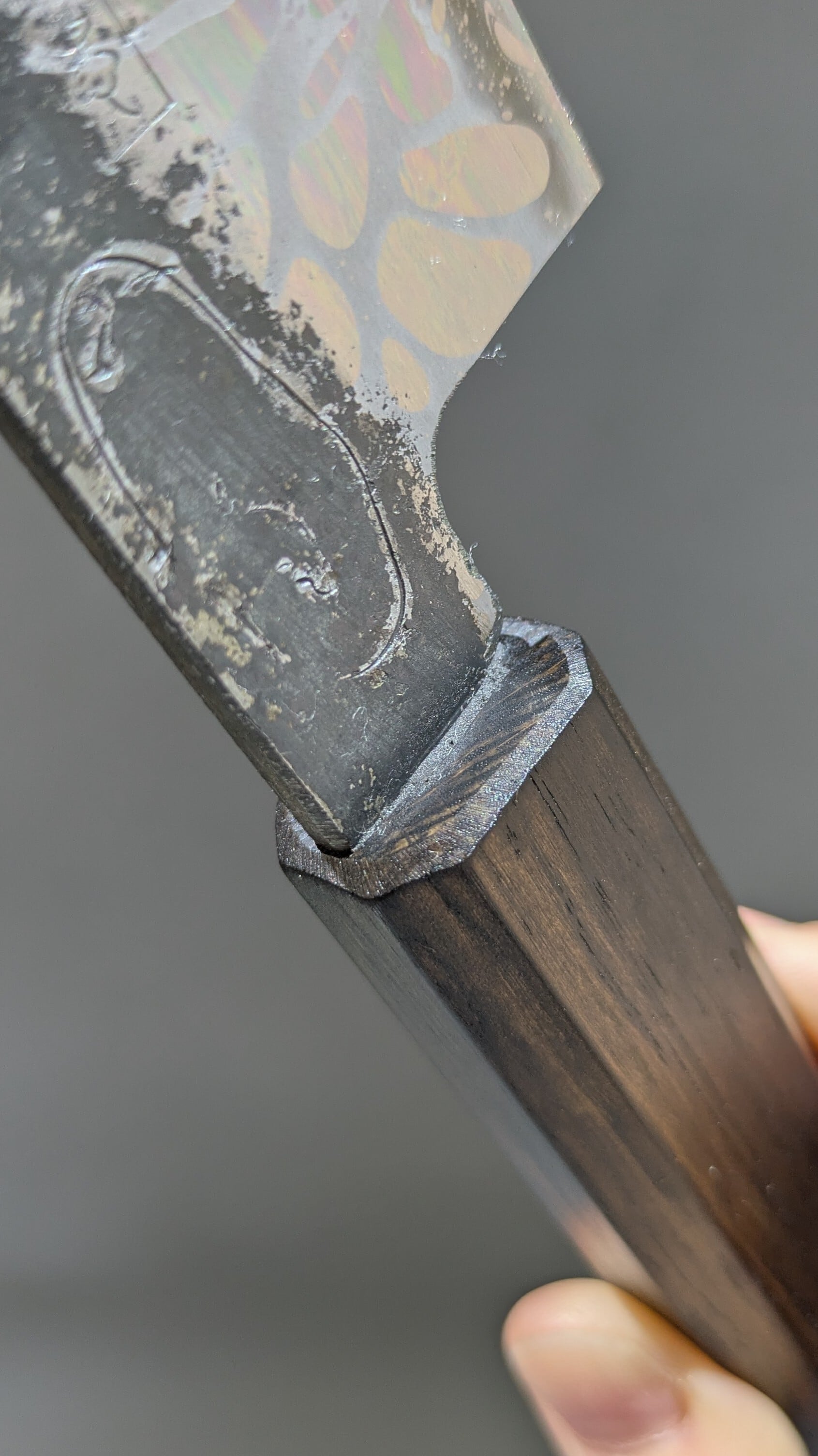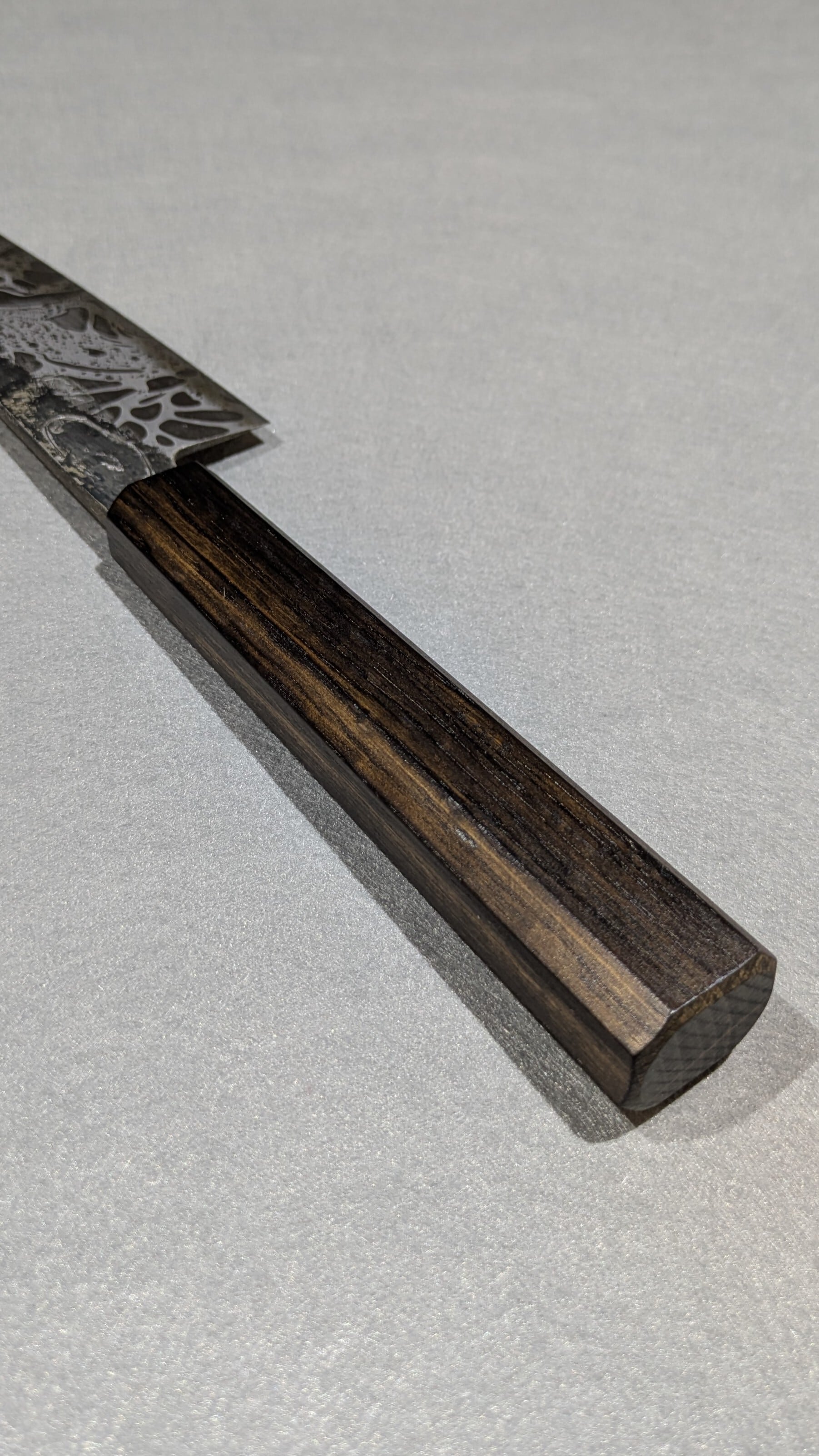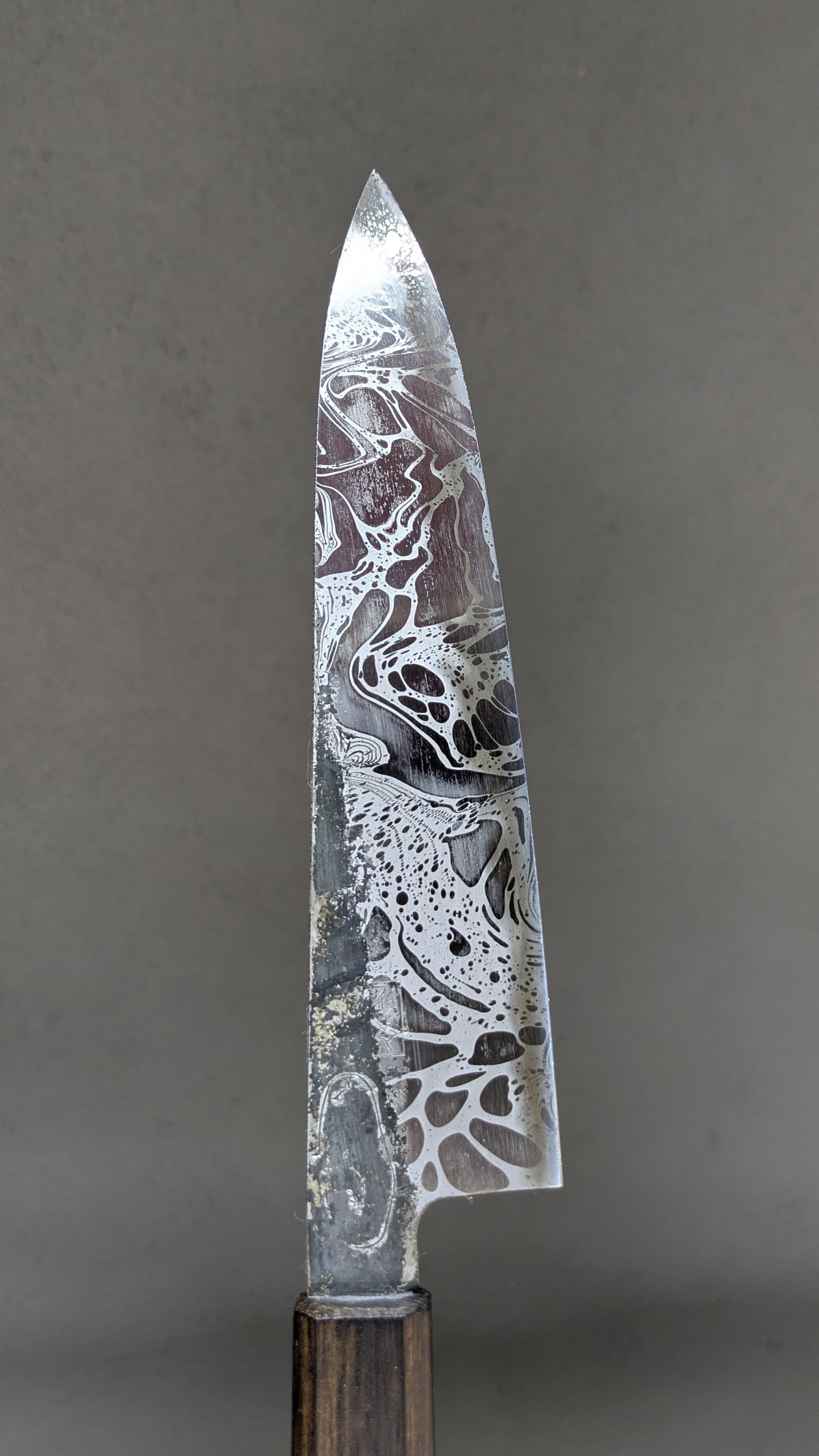 This is our shop's original kitchen knife. The blade surface has been etched to create a pattern.